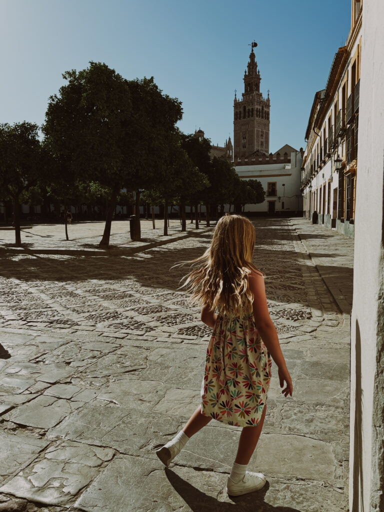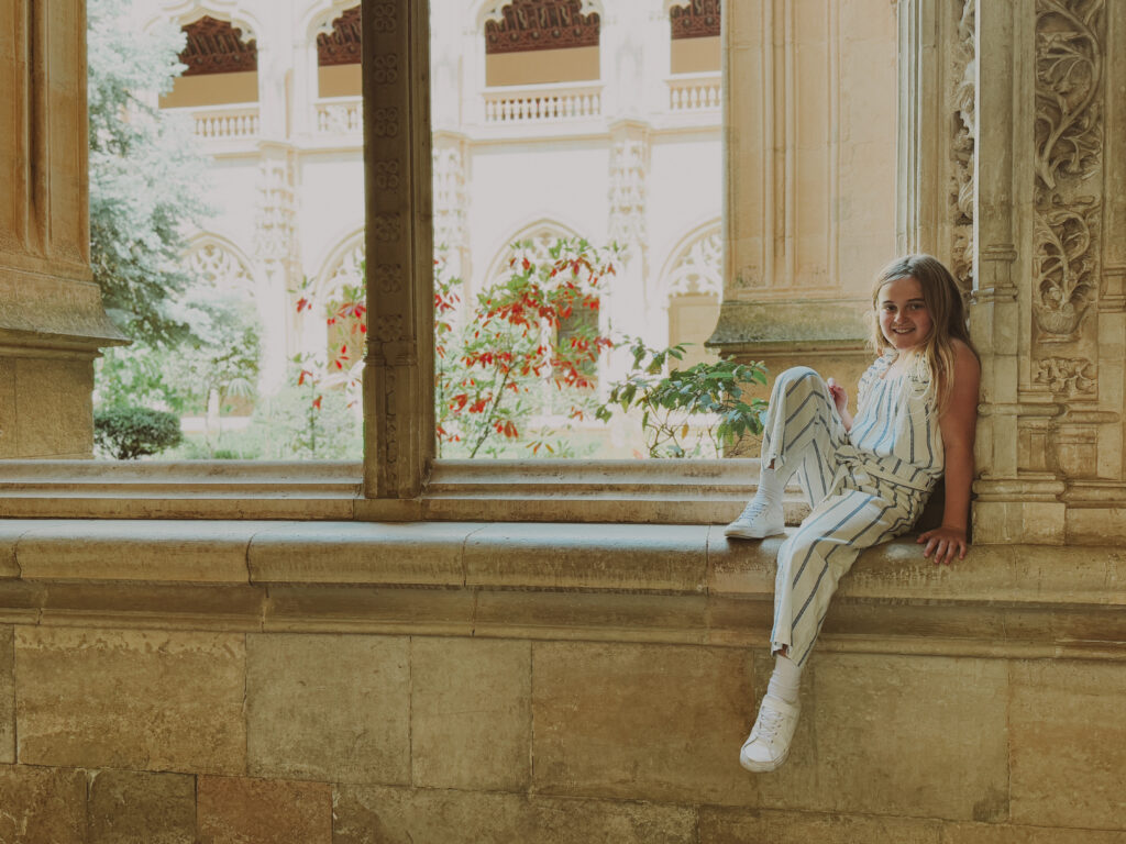 - If your travel destination is a city: This is trickier as all cities are different! You are going to have to do some homework to decide what the right color palette is. Do a few quick searches for ‘most instagramable spot in XYZ place’ and look at the type of scenery you are dealing with. Is it mostly historical architecture? You can get away with some pops of color and neutral basics. But not everywhere is so easy. When we went to Portugal, I knew I’d be photographing our kids against a lot of printed blue tiles. To compliment the backdrop I packed a wardrobe of creams and navy blues and steer clear of busy prints so that my kids wouldn’t clash with the historic tiles. Think you’ll be taking a lot of photographs in a city park? Steer clear of greens that will cause your family to blend into the background. The photo below is in Spain, I knew we’d be at this monument and that I’d be photographing the kids with a heavily saturated red wall in the background and went with creams and prints in the same color. When in doubt white paired with denim looks great!