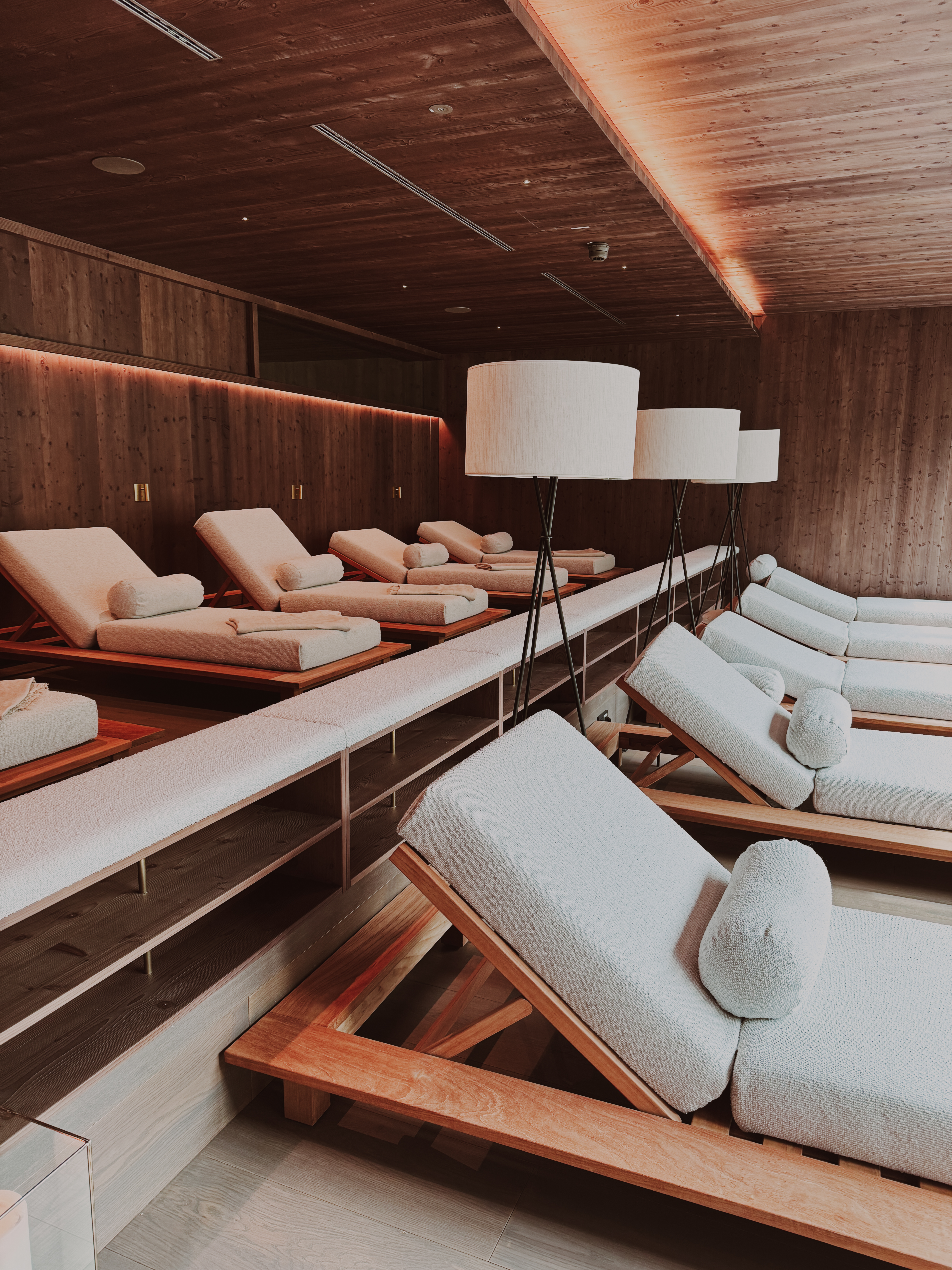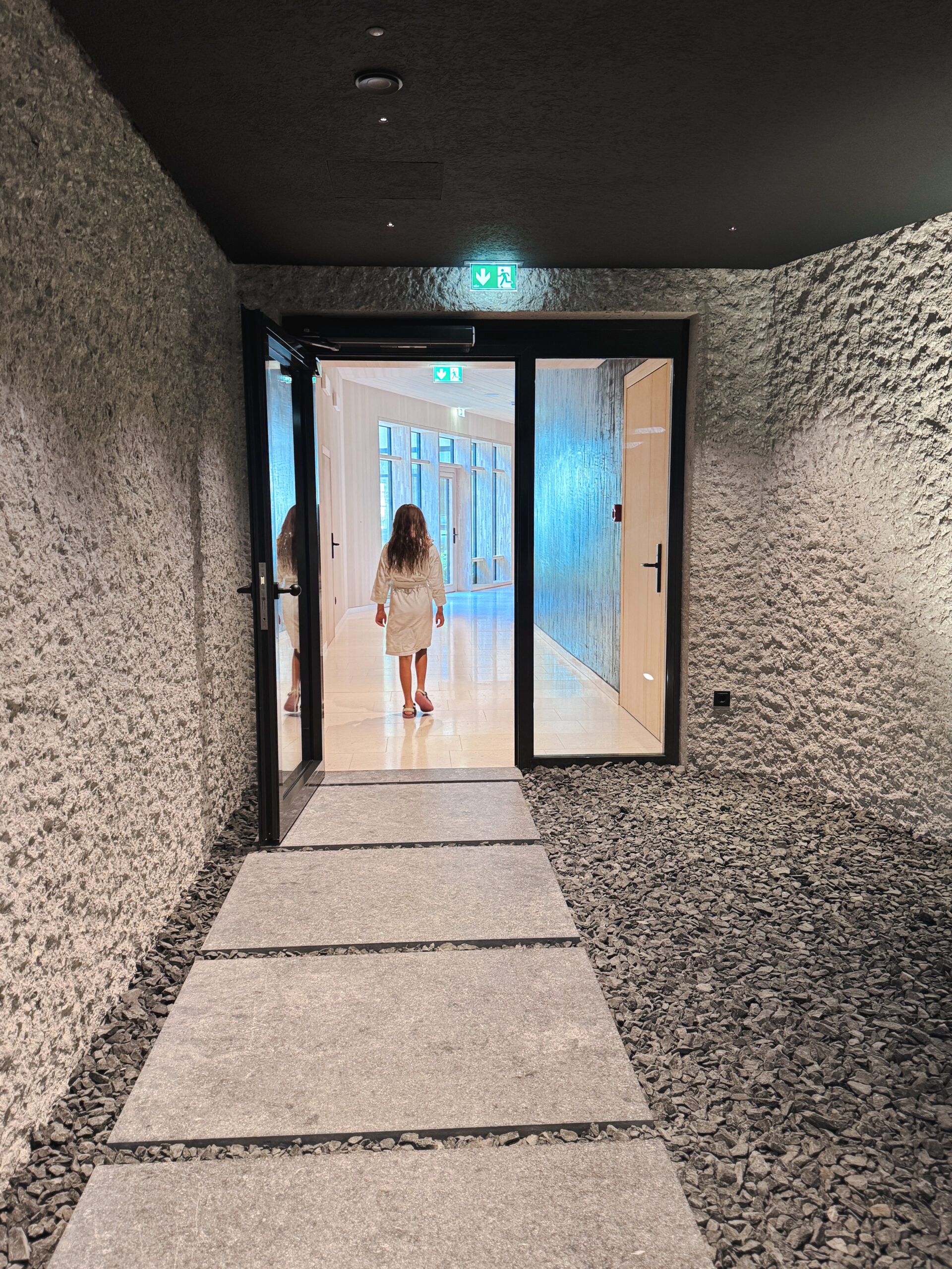 The sauna world includes multiple saunas (Finnish, herbal, infrared), a steam bath, ice fountain, and quiet relaxation zones. The first section is textile required and features a sauna and infrared room, further into the complex it is textile optional. There’s even a “wellness library” where you can curl up with a tea and admire the mountains through floor-to-ceiling glass. This quickly became my favorite place to spend early evenings!